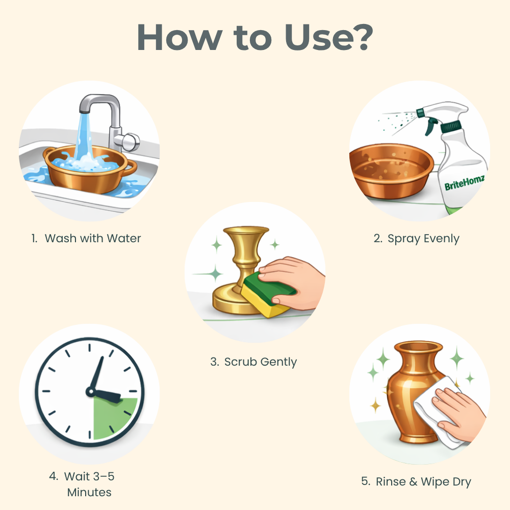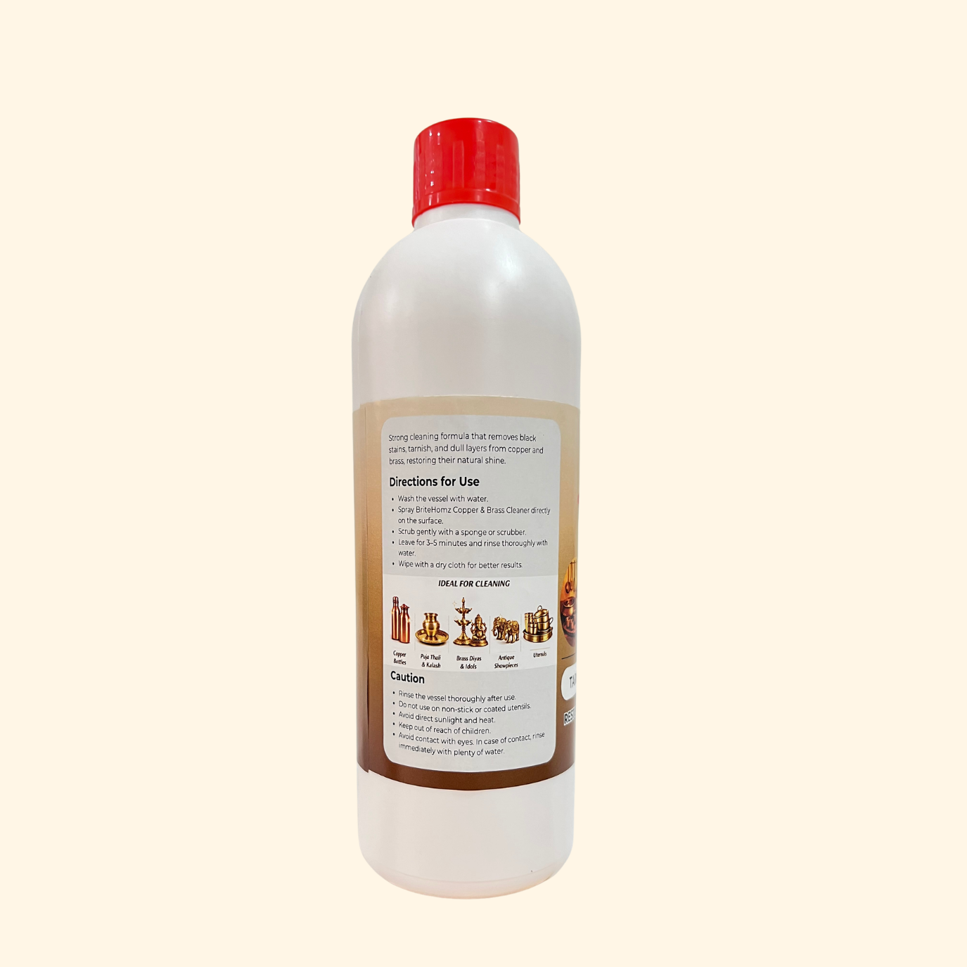BriteHomz Copper & Brass Cleaner is specially designed to bring back the original shine of your copper and brass items. It effectively removes tarnish, oxidation, and dull layers, making your utensils and pooja items look clean and renewed.