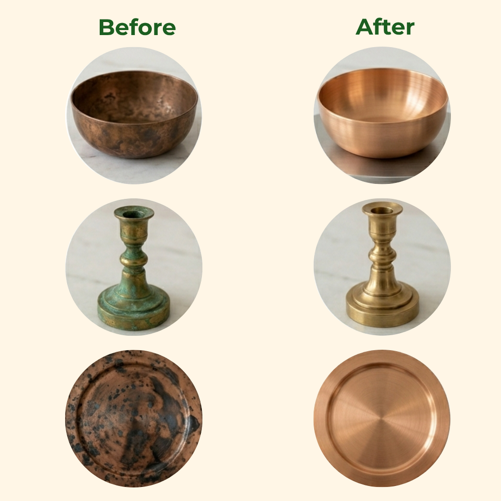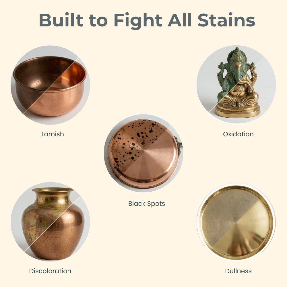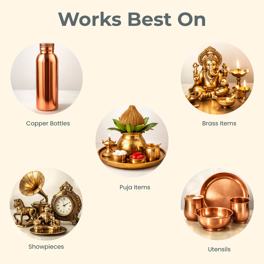 Powerful copper and brass cleaner that removes tarnish, oxidation, and dullness, restoring natural shine to utensils and pooja items without causing metal loss.